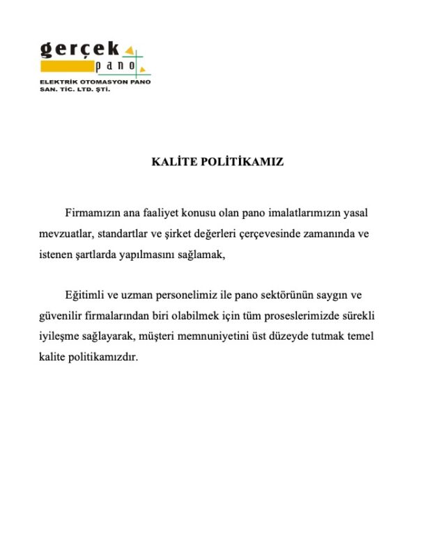 1997 yılında kurulan Gerçek Pano, elektrik ve otomasyon sektöründe mühendislik gücü, üretim kabiliyeti ve kalite vizyonu ile öne çıkan, köklü ve saygın bir mühendislik, pano ve taahhüt firmasıdır. 2.400 m² kapalı alanda faaliyet gösteren tesislerinde, alanında uzman 20 kişilik mühendis ve tekniker kadrosu ile AG dağıtım, Kompanzasyon, Motor Kumanda, PLC ve Klima Otomasyon Panolarının yüksek standartlarda projelendirme ve imalatını gerçekleştirmektedir. Gerçek Pano; özgün tasarım yaklaşımı, ileri teknolojiye sahip üretim altyapısı ve uluslararası normlara tam uyumlu kalite anlayışı ile endüstriyel ve ticari projelerde fark yaratan çözümler sunmaktadır. Her projede mühendislik disiplinini, estetik bakış açısını ve fonksiyonelliği bir araya getirerek uzun ömürlü, güvenilir ve sürdürülebilir sistemler üretmeyi temel hedefi olarak benimsemektedir. Firmamız; EAE PanelMaster Gold Partnerliği, Eaton xEnergy Partnerliği ile birlikte Siemens ve Eaton Elektrik Pano Partnerlikleri kapsamında, elektrik kabinleri ve pano sistemlerinde projelendirme, malzeme temini ve uygulama süreçlerini üst düzey kalite anlayışıyla yürütmüş; bu sayede birçok prestijli ve referans niteliği taşıyan projeye başarıyla imza atmıştır. Gerçek Pano, marka olmanın taşıdığı sorumluluğun bilinciyle; koşulsuz müşteri memnuniyetini, sürekli gelişimi ve mühendislikte mükemmeliyeti kurumsal kültürünün merkezine alarak, bugün olduğu gibi gelecekte de sektörüne yön veren, güvenilir ve seçkin çözümler sunmaya kararlılıkla devam edecektir.